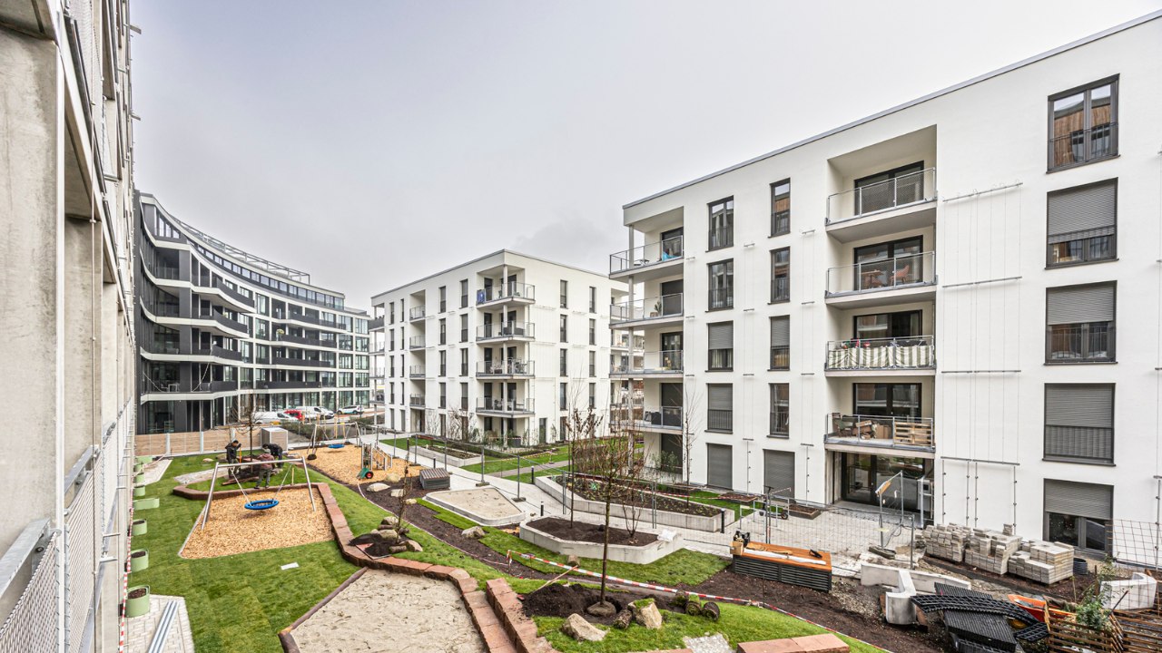 Ein umfassendes Mobilitätskonzept mit Tiefgarage, Fahrradstellplätzen, E-Ladeinfrastruktur sowie ein Mieterstrommodell mit PV-Anlagen auf den begrünten Dachflächen ergänzen das nachhaltige Gesamtkonzept. Die Außenanlagen bieten Spiel- und Aufenthaltsflächen für Groß und Klein. Mit dem Einzug der neuen Bewohnerinnen und Bewohner wird das Quartier am Güterbahnhof um ein lebendiges, familienfreundliches und durchgrüntes Wohnumfeld bereichert.