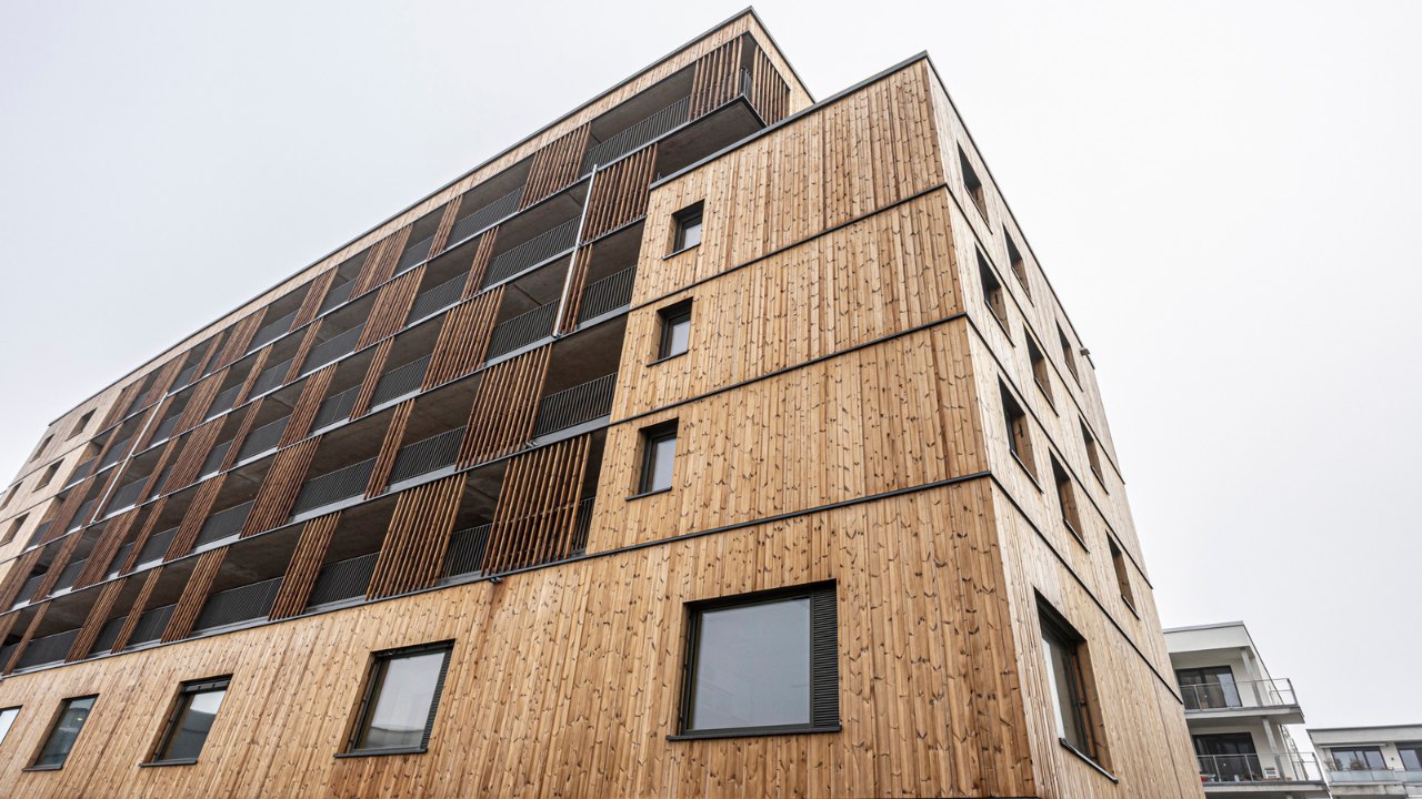 Das architektonische Konzept stammt vom Freiburger Büro Melder Binkert Prettner Kerner (mbpk) und überzeugt durch eine klare städtebauliche Struktur: Ein siebengeschossiger Baukörper mit Holzfassade zur Straße hin sowie zwei kompakte, fünfgeschossige Hofhäuser in monolithischer Bauweise schaffen über 5.000 Quadratmeter Wohnfläche. Die Wohnungen bieten eine ausgewogene Mischung von Ein- bis Vier-Zimmer-Wohnungen sowie zwei Sechs-Zimmer-Wohnungen. Im Projekt werden zudem zehn Kleinstwohnungen für Menschen, die von Obdachlosigkeit bedroht sind, errichtet.