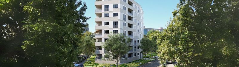 Die achtgeschossigen Gebäude orientieren sich an der umliegenden Bebauung, ihre kompakten Volumina hinterlassen jedoch einen kleineren Fußabdruck. Dadurch entstehen großzügige Außenraumflächen und damit unterschiedliche Spiel-, Freizeit- und Aufenthaltsmöglichkeiten. Die Fassaden haben wiederholende Fensterformate und geben Struktur. Vor- und Rücksprünge in Form von Fenstertaschen verstärken die plastische Wirkung des Baukörpers. Expressive Farbigkeit bildet einen Kontrast zur Nachbarbebauung.